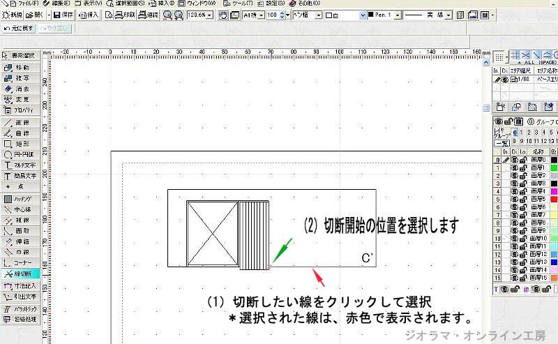 線が引けるようになったら、次は、不要な線を切断して取り除く方法です。