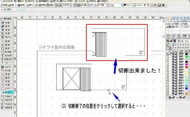 (3)次に切断したい終了位置を決め、クリックしますと同時に線が切断されます。